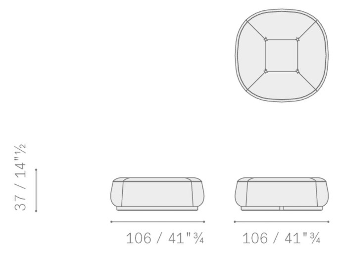 Leplì poufs are available with upholstery in Pelle Frau® leather or premium fabric, both enhanced by a decorative leather band. When upholstered in leather, the band is always color-matched for a seamless, sophisticated look. In the leather version, four elegant pleats radiate from the central button on the seat, defining the soft, sculptural profile of the pouf. In the fabric version, the pleated detail is replaced with a precise topstitch, giving the pouf a tailored, contemporary aesthetic.