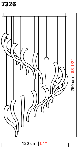 The basic feature of Swing is an elegant piece of crafted glass with the “a balotòn” technique, that gives the collection exceptional dynamism and a striking theatrical presence. Supported by slender steel cables attached to a thin structure on the ceiling, these parts form delicately sinuous and wavering figures, in circular or free-form configurations.